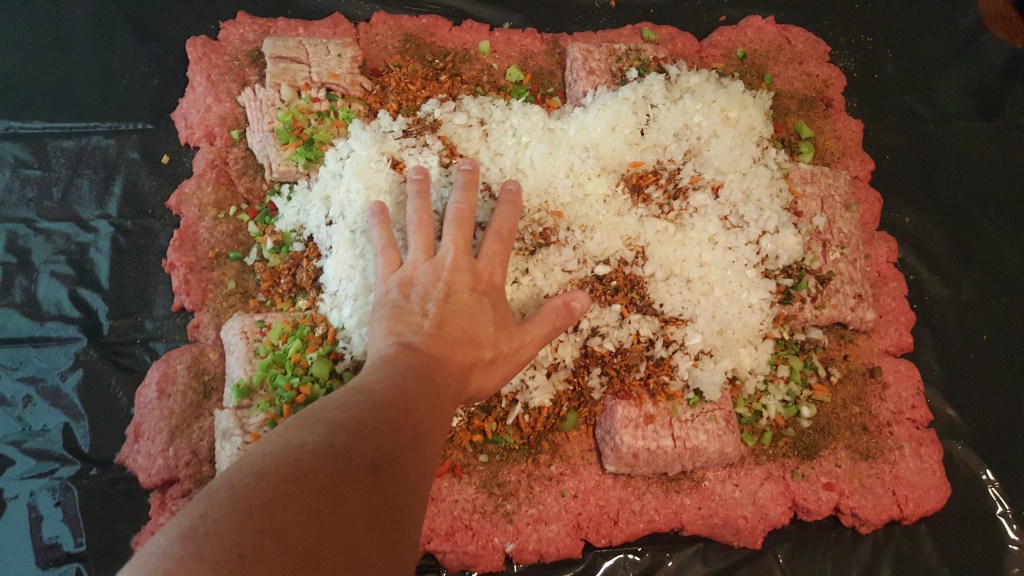 Once I have it all prepped and stacked on the table, I knead the entire mixture by hand like a huge ball of bread dough until everything is thoroughly mixed. Yes, other than the fresh vegetables, the meat and frozen veggie ingredients are very COLD, so you must do everything as quickly as possible to prevent feeling like you’re getting frostbite in your hands and fingers and avoid potential meat spoilage if it sits out for too many hours. Luckily you can easily work for 4-6 hours in a moderately cool kitchen without any problems as long as the meat is good and cold when you start the process. I usually let the meat sit in my fridge for a couple of days beforehand to make sure that it is cold through-and-through. I also highly recommend that you coat your hands and wrists or plastic food service gloves with avocado oil before you start kneading the meat and other ingredients together. The oil prevents the meat and spices from sticking and gumming up your hands, which makes washing them much easier afterward. This also means that you want to wash them REALLY WELL before starting if you are not using gloves.