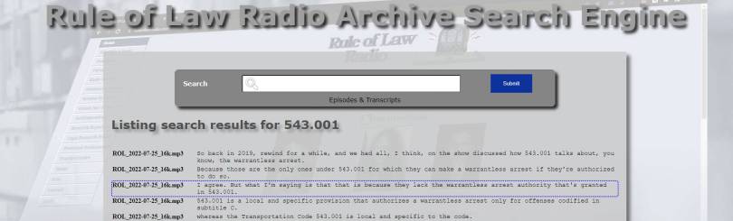 Max Alva, a listener of the show, has created a website that will let you search the audio archives of the Rule of Law Radio show. All 2252 episodes of the show going back to 2009 have been transcribed and are now searchable!